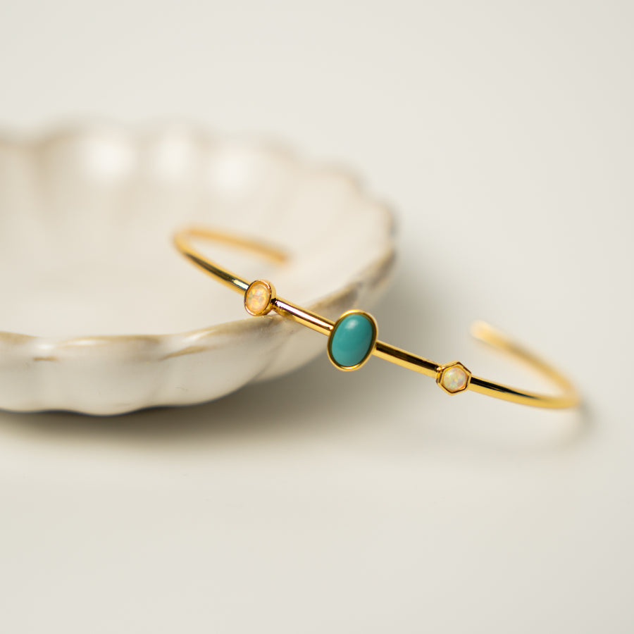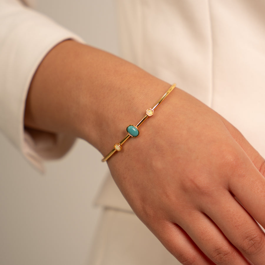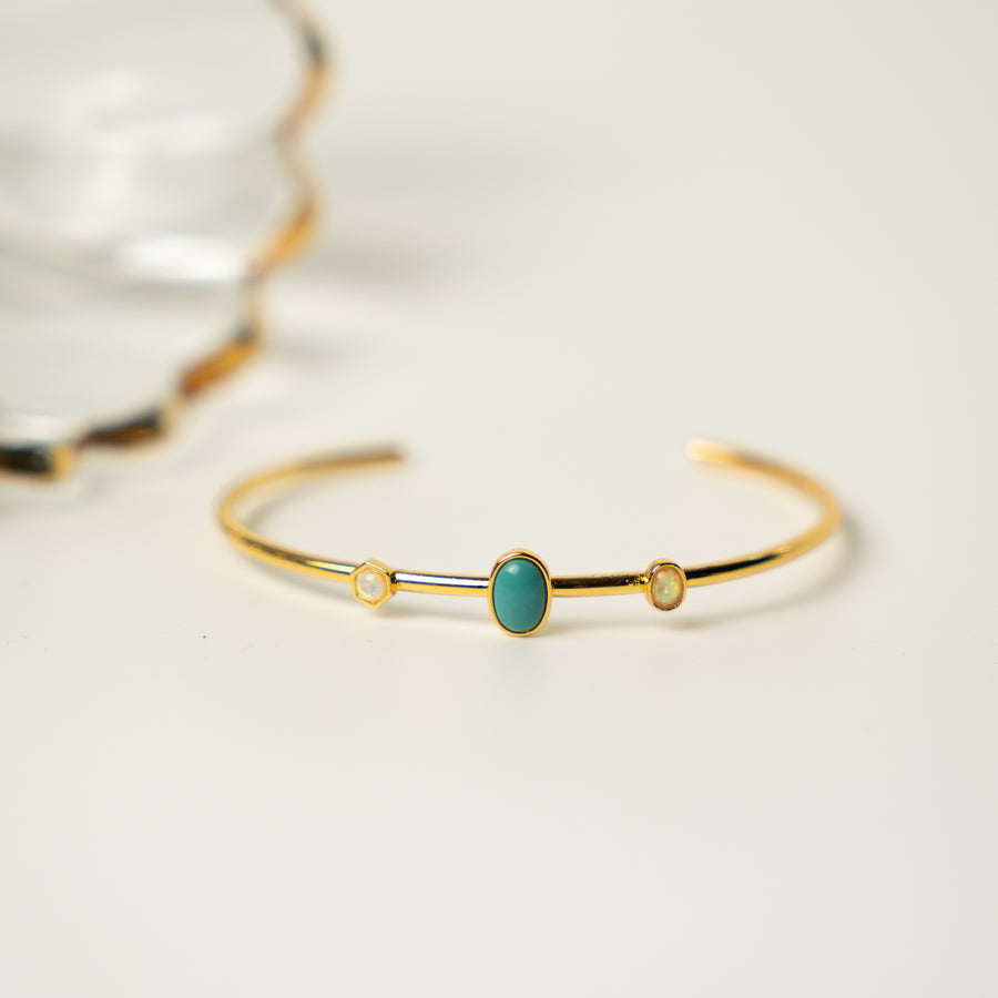 Ez a finoman ívelt cuff típusú karkötő a visszafogott stílus és a kifinomult részletek találkozása. A karcsú, aranyszínű forma középen elhelyezett diszkrét türkiz és opál árnyalatú kövek halk, mégis hatásos fókuszpontot teremtenek – a tenger nyugalmát és a napfény játékát idézve meg.