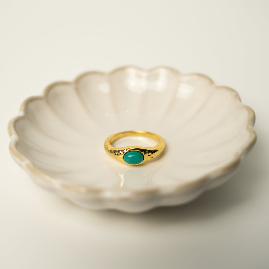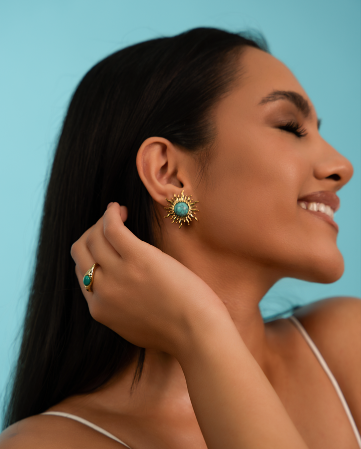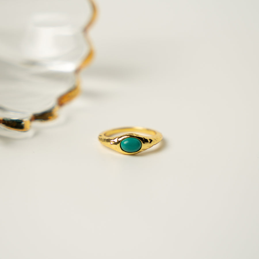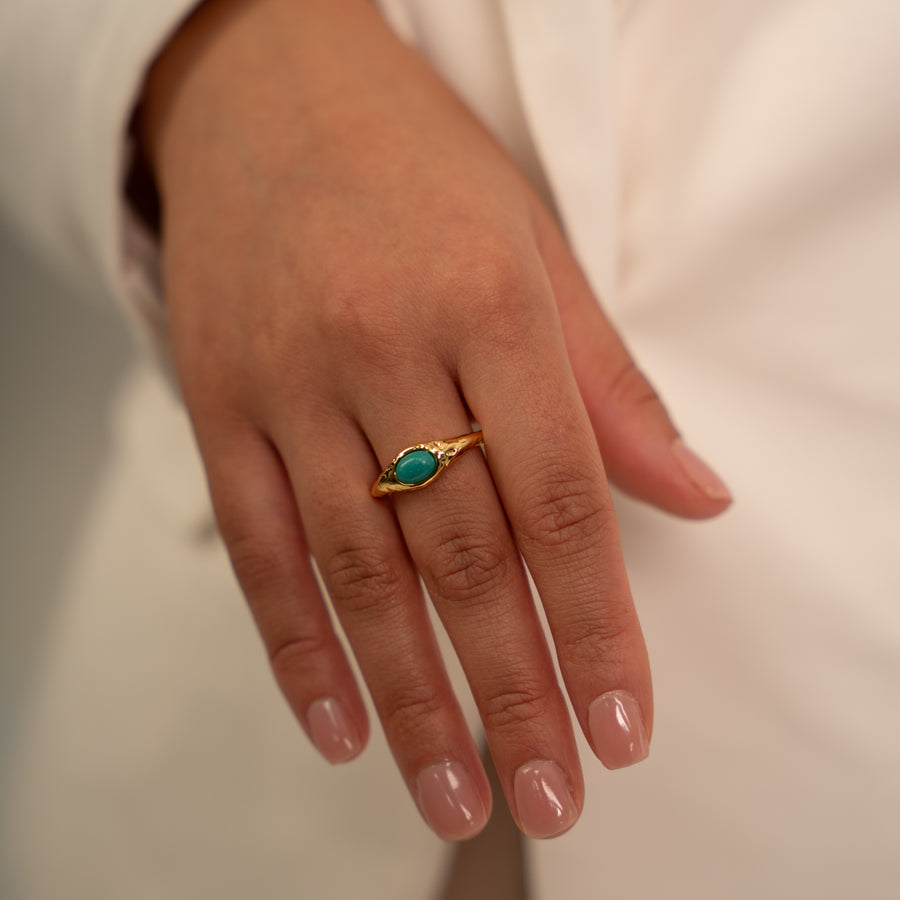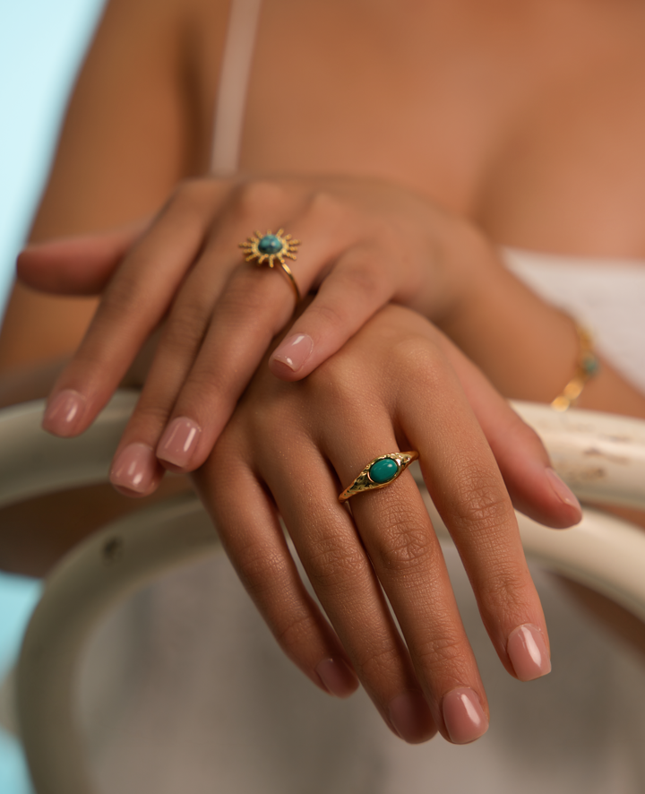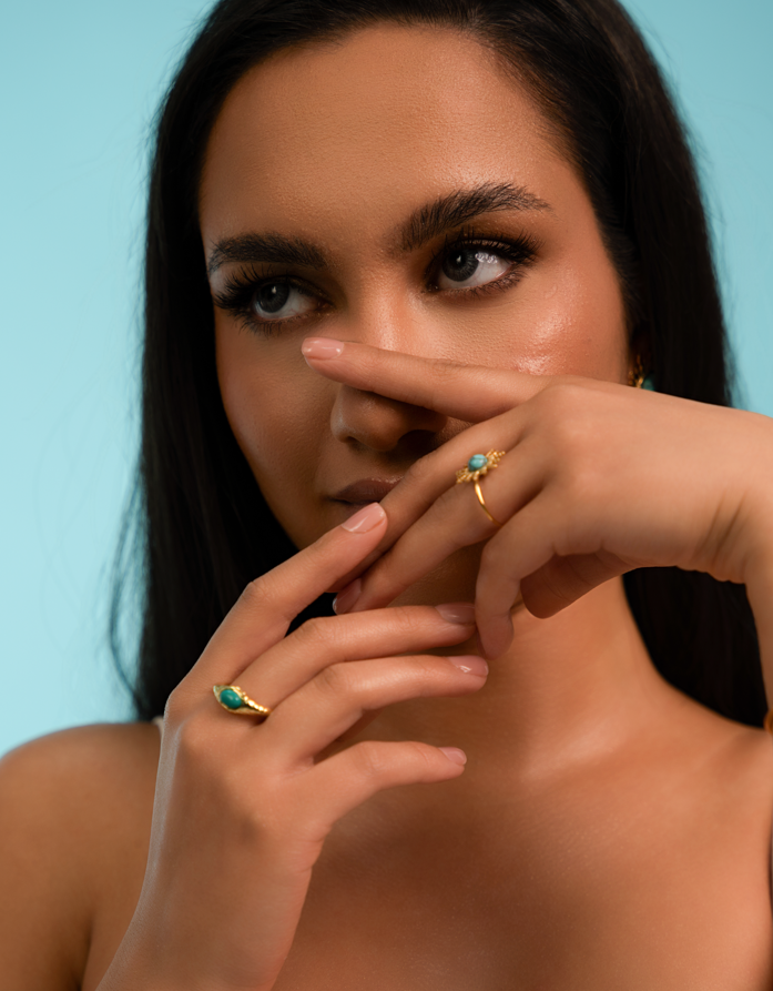 Ez a rusztikus, struktúrált felületű statement gyűrű a föld és a víz találkozását idézi meg. Középpontjában egy hangsúlyos türkiz kő ragyog, melynek organikus formája minden darabot egyedivé tesz. A texturált fém keret vad és mégis harmonikus, mintha az idő és természet formálta volna.