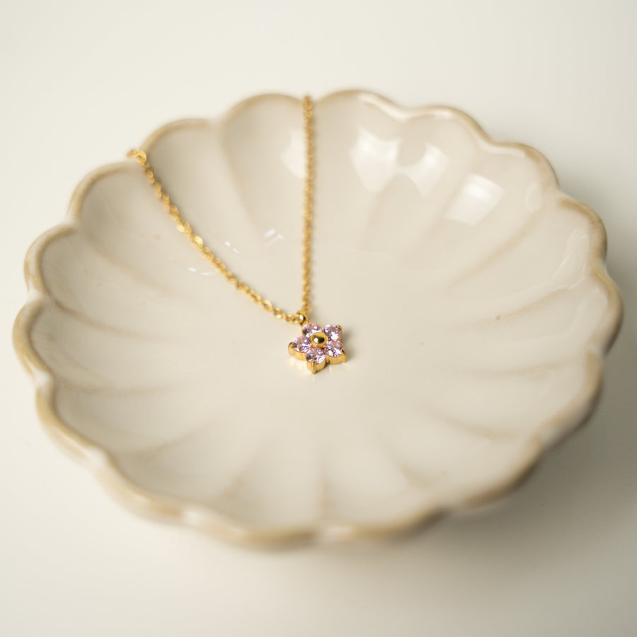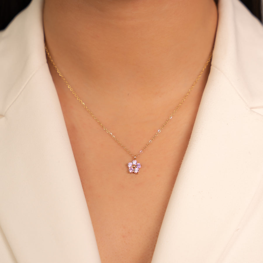 A Florin Pink nyaklánc egy aprólékosan megmunkált, mégis letisztult darab, amely a visszafogott eleganciát egy csepp játékossággal ötvözi. Középpontjában egy apró, rózsaszínes árnyalatú cirkóniákkal kirakott virágmedál áll, amely lágyan simul a nyak vonalára, kiemelve viselője nőiességét.