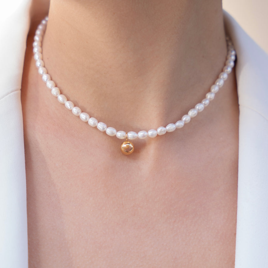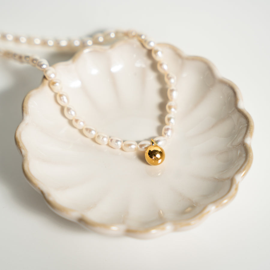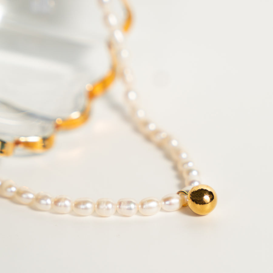 Valódi, édesvízi gyöngysor, aranyozott, hipoallergén, vízálló nemesacél részletekkel.